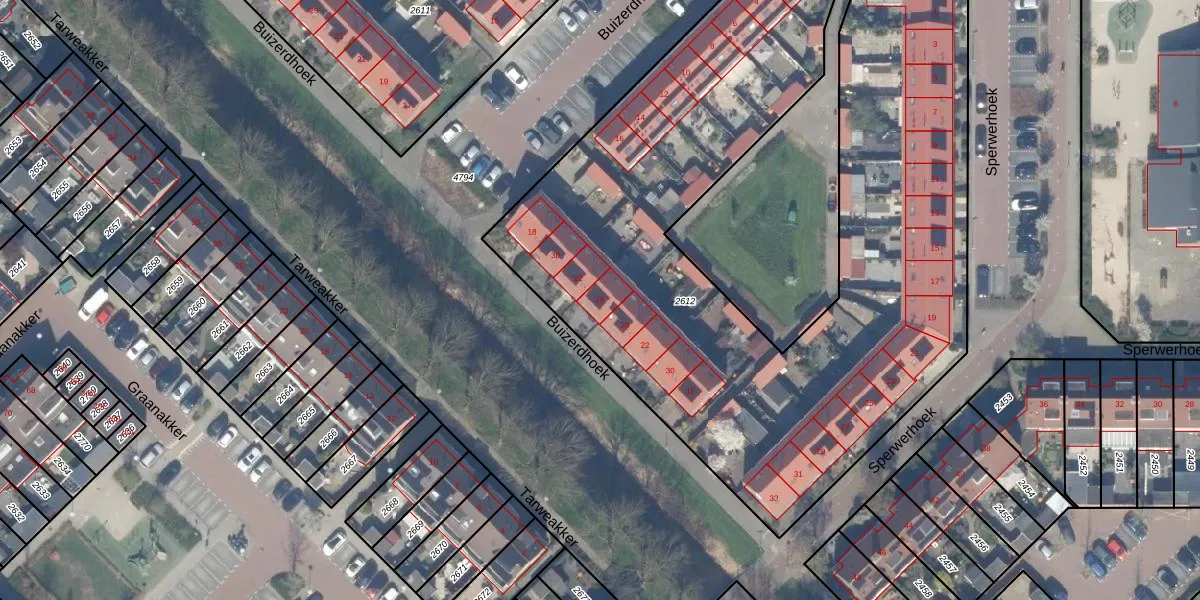 Buizerdhoek 24 is gelegen op kadastraal perceel WDV01C2612. Deze kadastrale aanduiding is uniek en wordt gebruikt door het Kadaster om eigendomsrechten en andere zakelijke rechten vast te leggen. Het perceel maakt onderdeel uit van de kadastrale gemeente Waddinxveen.
