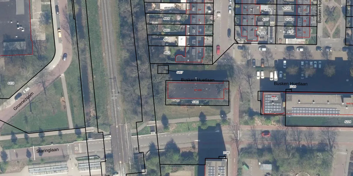 Het perceel waarop Busken Huetlaan 100 staat heeft een oppervlakte van 511 m². Dit is een groot perceel. De perceeloppervlakte wordt geregistreerd door het Kadaster. Gedetailleerde informatie over de maten van dit perceel kunt u vinden in het rapport Kadastrale kaart met maatvoering van Busken Huetlaan 100.