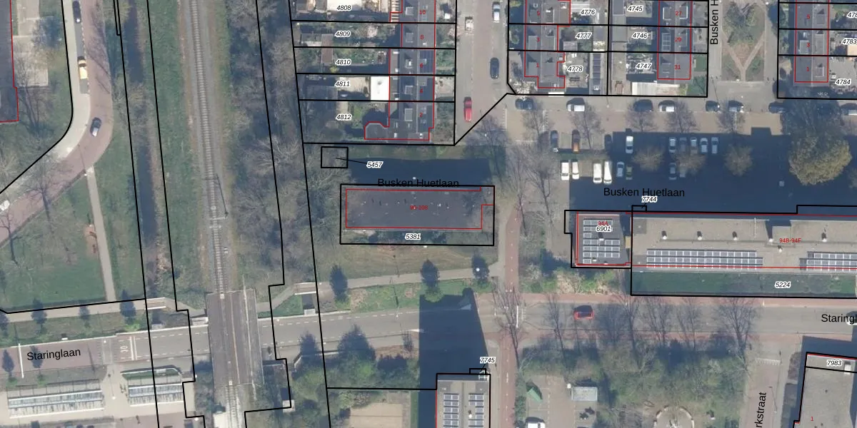 Het perceel waarop Busken Huetlaan 104 staat heeft een oppervlakte van 511 m². Dit is een groot perceel. De perceeloppervlakte wordt geregistreerd door het Kadaster. Gedetailleerde informatie over de maten van dit perceel kunt u vinden in het rapport Kadastrale kaart met maatvoering van Busken Huetlaan 104.
