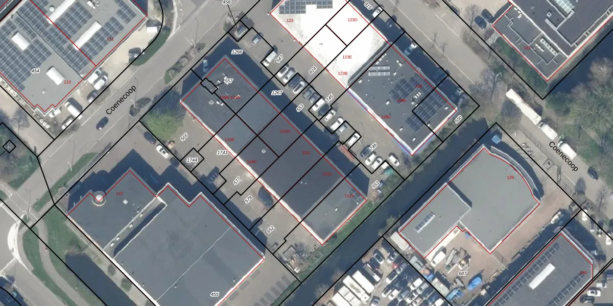 Het perceel waarop Coenecoop 121-I staat heeft een oppervlakte van 455 m². Dit is een groot perceel. De perceeloppervlakte wordt geregistreerd door het Kadaster. Gedetailleerde informatie over de maten van dit perceel kunt u vinden in het rapport Kadastrale kaart met maatvoering van Coenecoop 121-I.
