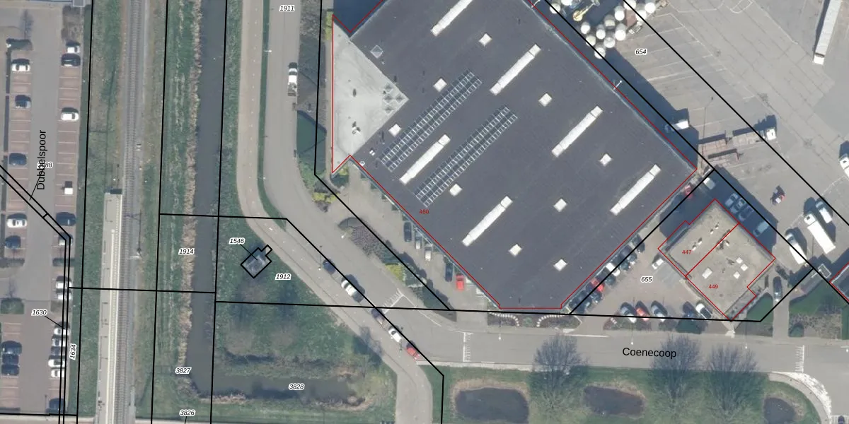 Het perceel waarop Coenecoop 450 staat heeft een oppervlakte van 6330 m². Dit is een zeer groot perceel. De perceeloppervlakte wordt geregistreerd door het Kadaster. Gedetailleerde informatie over de maten van dit perceel kunt u vinden in het rapport Kadastrale kaart met maatvoering van Coenecoop 450.
