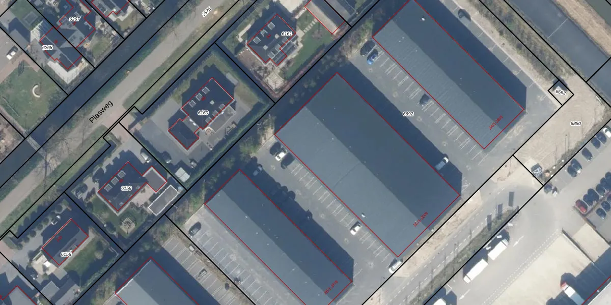 Het perceel waarop het adres ligt is WDV01-C-6692. De afkorting 'WDV01' staat voor kadastrale gemeente Waddinxveen. De oppervlakte van het perceel is 8155 m². Dat is groter dan gemiddeld in Waddinxveen, waar de gemiddelde perceeloppervlakte op 2158,97 m² ligt. Het grootste perceel in de kadastrale gemeente is 49,8 ha. Het kleinste perceel heeft een oppervlakte van 0 m². Op het perceel liggen in totaal 54 adressen. De laatste wijziging in het de Basisregistratie Kadaster (BRK) was op 21-08-2024.
