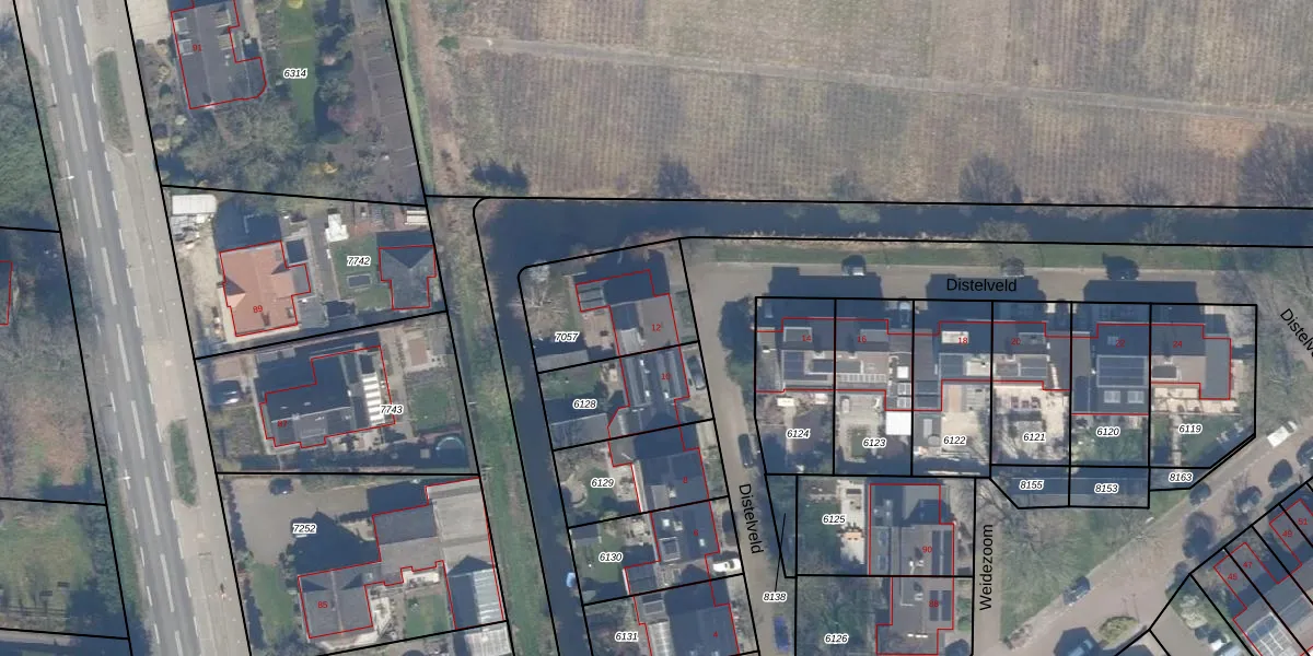 Distelveld 12 is gelegen op kadastraal perceel WDV01B7057. Deze kadastrale aanduiding is uniek en wordt gebruikt door het Kadaster om eigendomsrechten en andere zakelijke rechten vast te leggen. Het perceel maakt onderdeel uit van de kadastrale gemeente Waddinxveen.