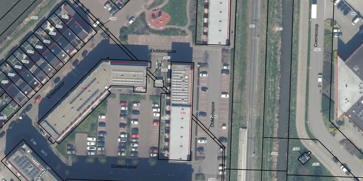 Het perceel waarop Dubbelspoor 19 staat heeft een oppervlakte van 865 m². Dit is een groot perceel. De perceeloppervlakte wordt geregistreerd door het Kadaster. Gedetailleerde informatie over de maten van dit perceel kunt u vinden in het rapport Kadastrale kaart met maatvoering van Dubbelspoor 19.