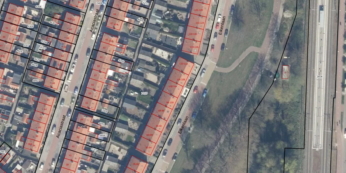 Het perceel waarop Eikenlaan 102 staat heeft een oppervlakte van 7673 m². Dit is een zeer groot perceel. De perceeloppervlakte wordt geregistreerd door het Kadaster. Gedetailleerde informatie over de maten van dit perceel kunt u vinden in het rapport Kadastrale kaart met maatvoering van Eikenlaan 102.