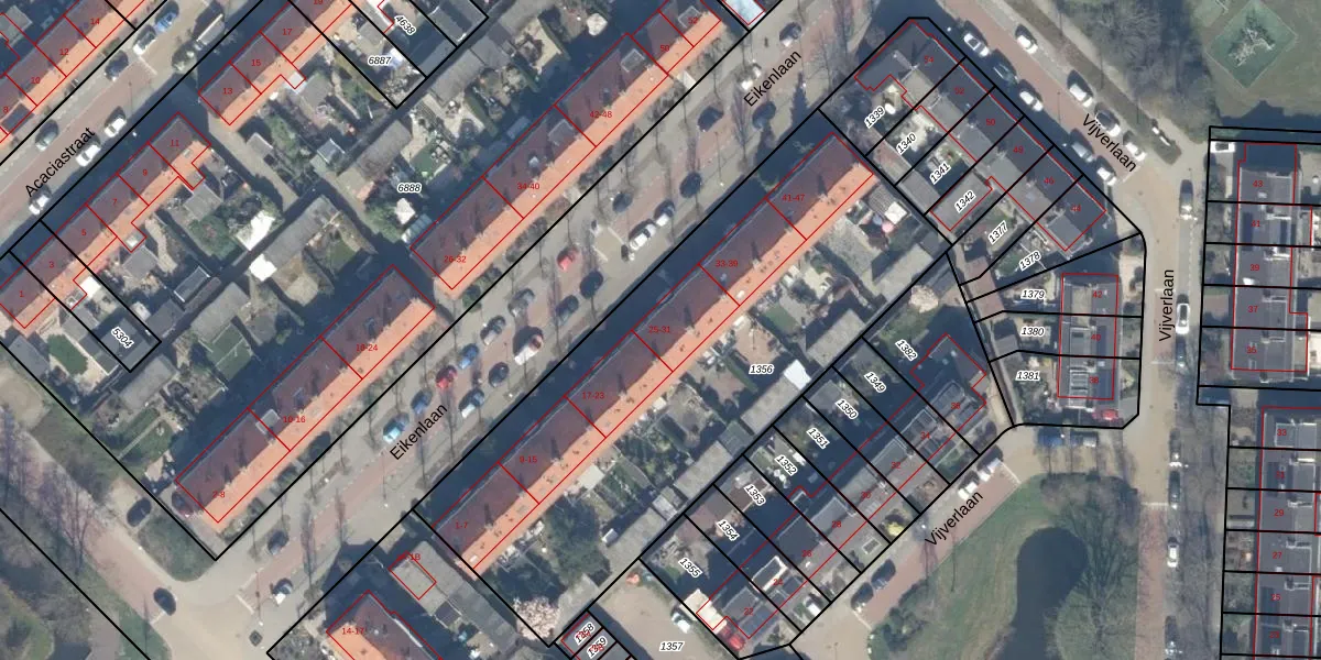 Eikenlaan 25 is gelegen op kadastraal perceel WDV01C1356. Deze kadastrale aanduiding is uniek en wordt gebruikt door het Kadaster om eigendomsrechten en andere zakelijke rechten vast te leggen. Het perceel maakt onderdeel uit van de kadastrale gemeente Waddinxveen.