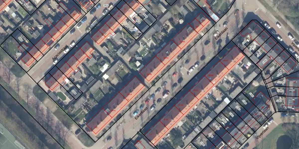 Het perceel waarop Eikenlaan 26 staat heeft een oppervlakte van 5258 m². Dit is een zeer groot perceel. De perceeloppervlakte wordt geregistreerd door het Kadaster. Gedetailleerde informatie over de maten van dit perceel kunt u vinden in het rapport Kadastrale kaart met maatvoering van Eikenlaan 26.