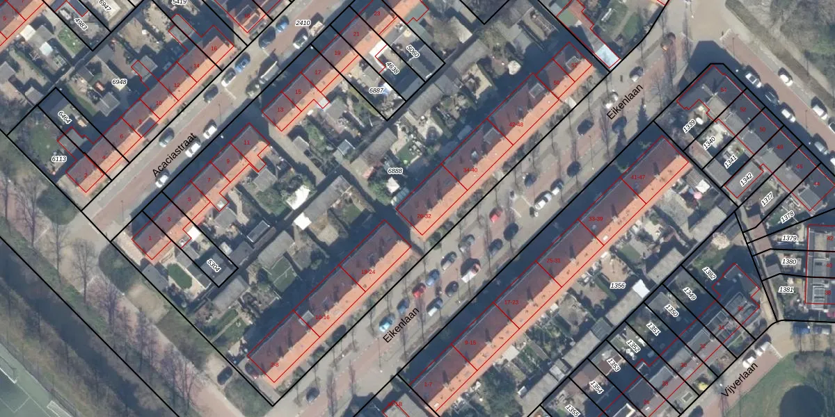 Het perceel waarop Eikenlaan 28 staat heeft een oppervlakte van 5258 m². Dit is een zeer groot perceel. De perceeloppervlakte wordt geregistreerd door het Kadaster. Gedetailleerde informatie over de maten van dit perceel kunt u vinden in het rapport Kadastrale kaart met maatvoering van Eikenlaan 28.