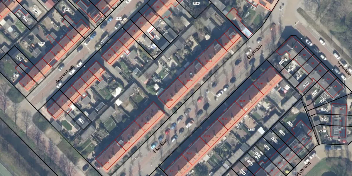 Het perceel waarop Eikenlaan 30 staat heeft een oppervlakte van 5258 m². Dit is een zeer groot perceel. De perceeloppervlakte wordt geregistreerd door het Kadaster. Gedetailleerde informatie over de maten van dit perceel kunt u vinden in het rapport Kadastrale kaart met maatvoering van Eikenlaan 30.