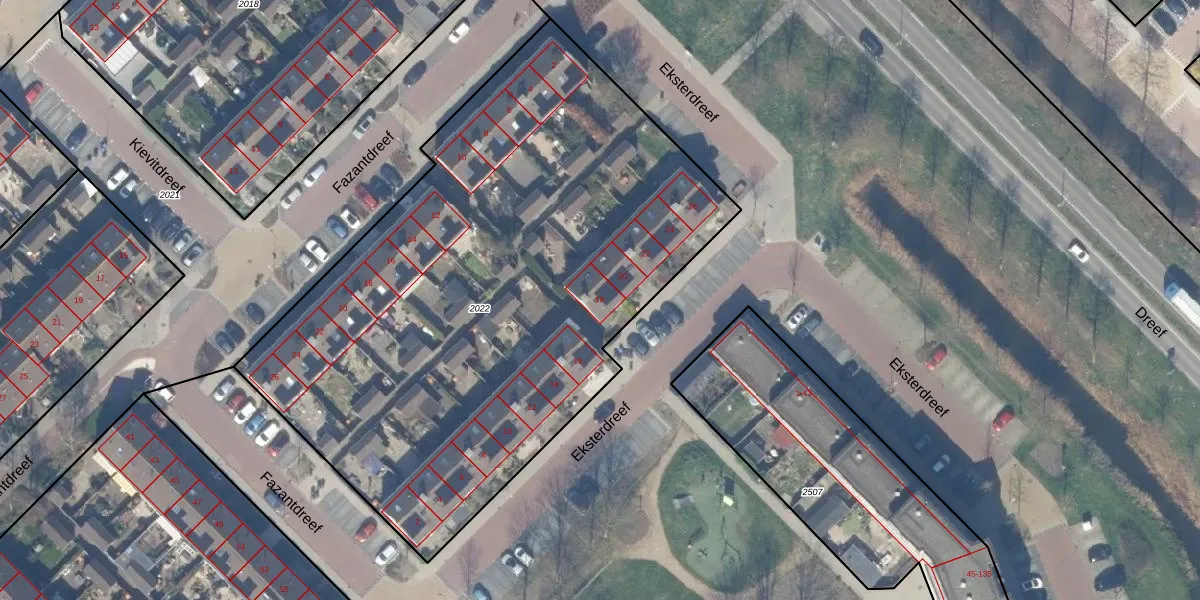 Eksterdreef 18 is gelegen op kadastraal perceel WDV01C2022. Deze kadastrale aanduiding is uniek en wordt gebruikt door het Kadaster om eigendomsrechten en andere zakelijke rechten vast te leggen. Het perceel maakt onderdeel uit van de kadastrale gemeente Waddinxveen.