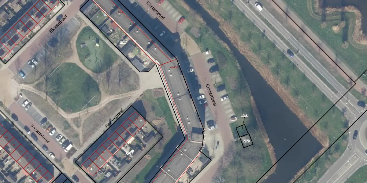 Het perceel waarop Eksterdreef 49 staat heeft een oppervlakte van 2360 m². Dit is een zeer groot perceel. De perceeloppervlakte wordt geregistreerd door het Kadaster. Gedetailleerde informatie over de maten van dit perceel kunt u vinden in het rapport Kadastrale kaart met maatvoering van Eksterdreef 49.