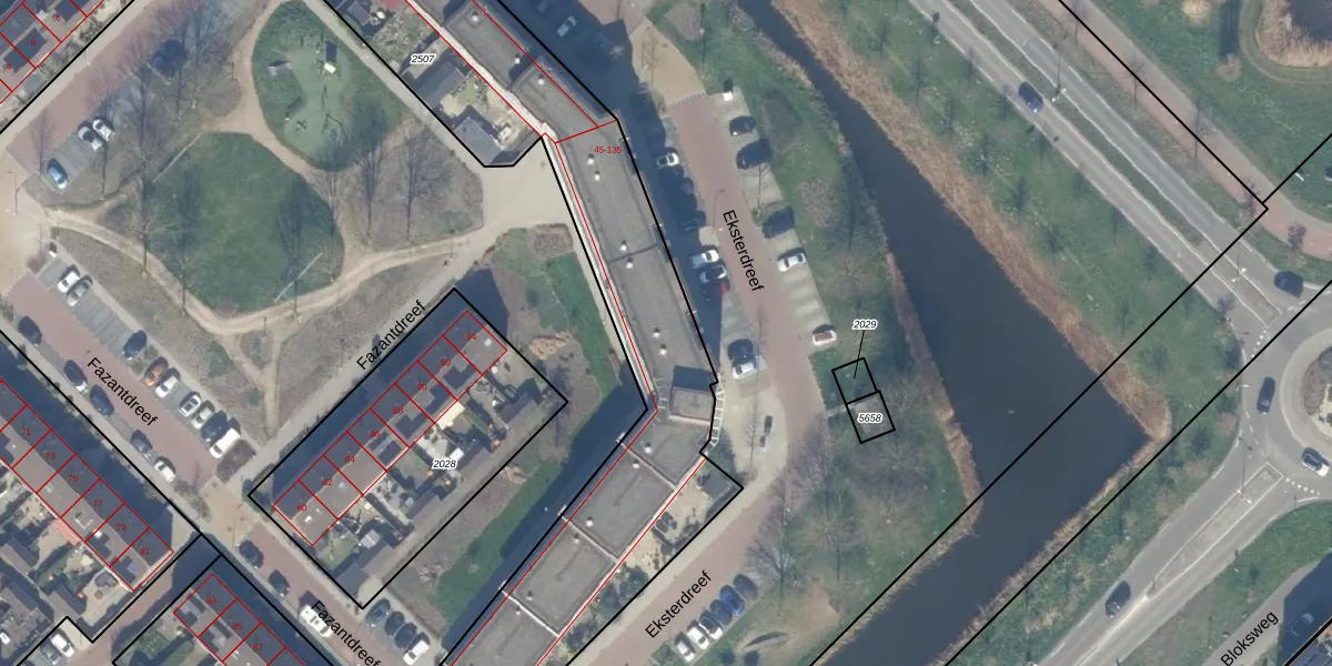 Het perceel waarop Eksterdreef 65 staat heeft een oppervlakte van 2360 m². Dit is een zeer groot perceel. De perceeloppervlakte wordt geregistreerd door het Kadaster. Gedetailleerde informatie over de maten van dit perceel kunt u vinden in het rapport Kadastrale kaart met maatvoering van Eksterdreef 65.