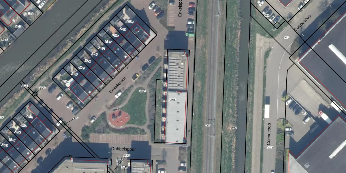 Enkelspoor 54 is gelegen op kadastraal perceel WDV01E2065. Deze kadastrale aanduiding is uniek en wordt gebruikt door het Kadaster om eigendomsrechten en andere zakelijke rechten vast te leggen. Het perceel maakt onderdeel uit van de kadastrale gemeente Waddinxveen.