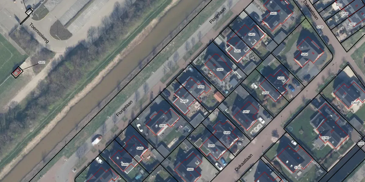 Florijnlaan 9 is gelegen op kadastraal perceel WDV01C5448. Deze kadastrale aanduiding is uniek en wordt gebruikt door het Kadaster om eigendomsrechten en andere zakelijke rechten vast te leggen. Het perceel maakt onderdeel uit van de kadastrale gemeente Waddinxveen.