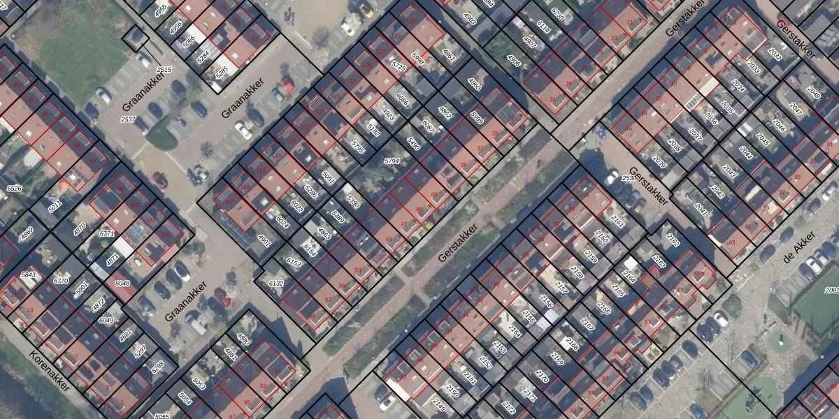 Het perceel waarop Gerstakker 45 staat heeft een oppervlakte van 448 m². Dit is een groot perceel. De perceeloppervlakte wordt geregistreerd door het Kadaster. Gedetailleerde informatie over de maten van dit perceel kunt u vinden in het rapport Kadastrale kaart met maatvoering van Gerstakker 45.