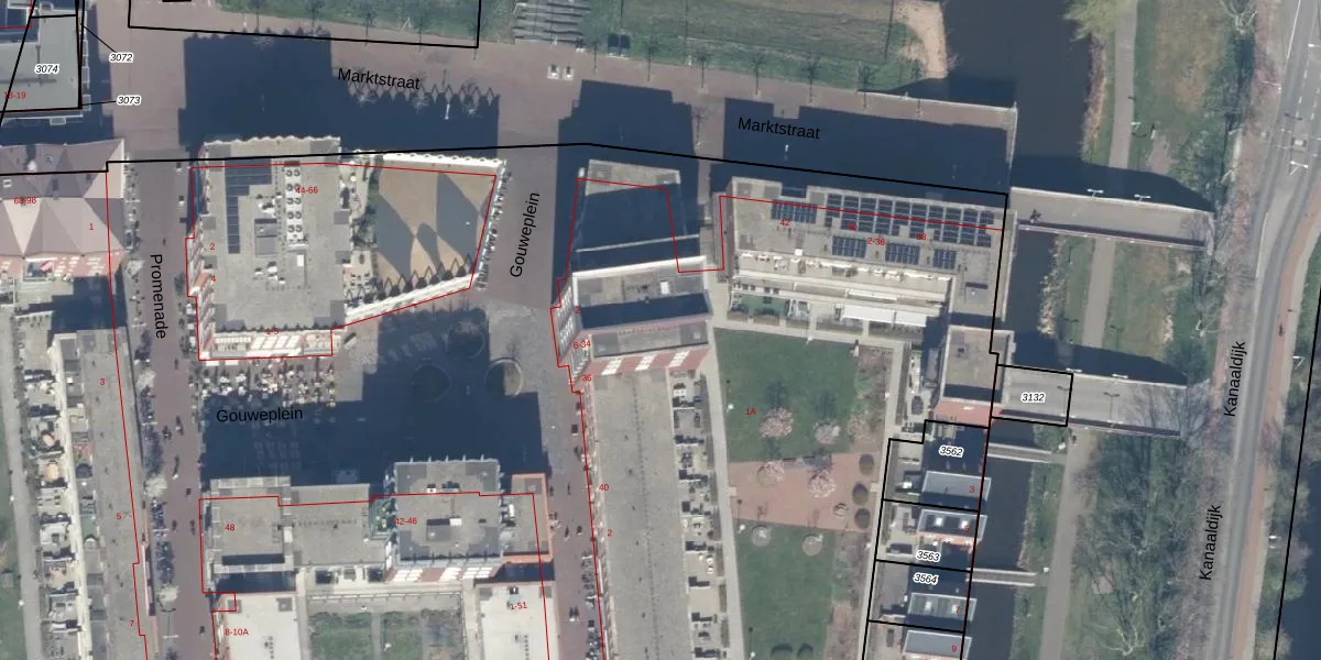 Het perceel waarop Gouweplein 20 staat heeft een oppervlakte van 3,1 ha. Dit is een zeer groot perceel. De perceeloppervlakte wordt geregistreerd door het Kadaster. Gedetailleerde informatie over de maten van dit perceel kunt u vinden in het rapport Kadastrale kaart met maatvoering van Gouweplein 20.