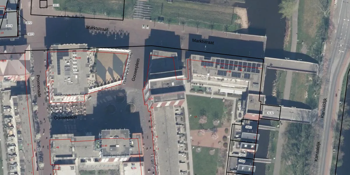 Het perceel waarop Gouweplein 24 staat heeft een oppervlakte van 3,1 ha. Dit is een zeer groot perceel. De perceeloppervlakte wordt geregistreerd door het Kadaster. Gedetailleerde informatie over de maten van dit perceel kunt u vinden in het rapport Kadastrale kaart met maatvoering van Gouweplein 24.