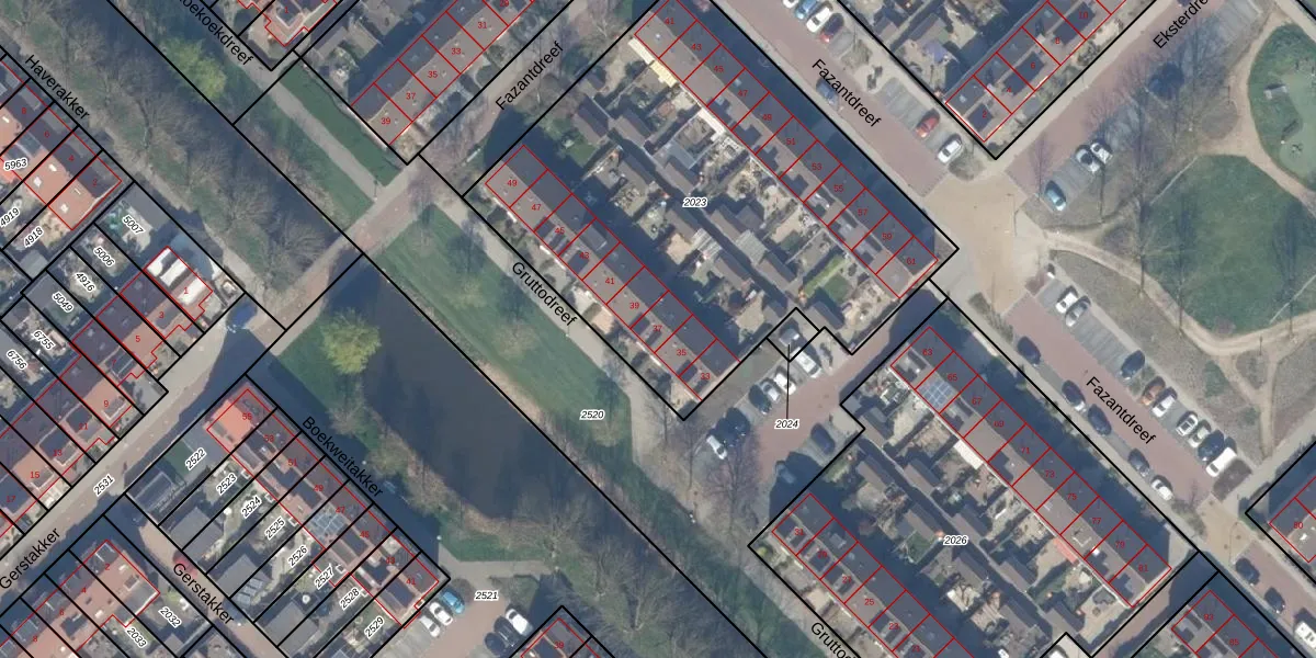Het perceel waarop Gruttodreef 37 staat heeft een oppervlakte van 2568 m². Dit is een zeer groot perceel. De perceeloppervlakte wordt geregistreerd door het Kadaster. Gedetailleerde informatie over de maten van dit perceel kunt u vinden in het rapport Kadastrale kaart met maatvoering van Gruttodreef 37.