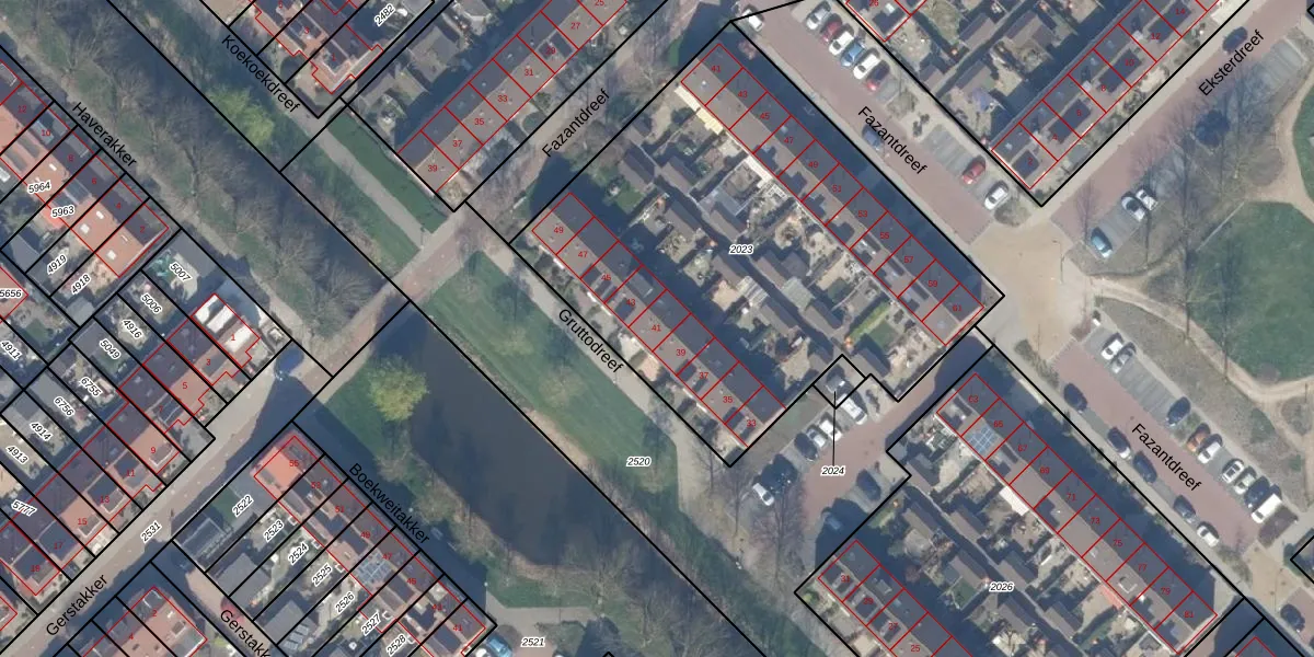 Het perceel waarop Gruttodreef 41 staat heeft een oppervlakte van 2568 m². Dit is een zeer groot perceel. De perceeloppervlakte wordt geregistreerd door het Kadaster. Gedetailleerde informatie over de maten van dit perceel kunt u vinden in het rapport Kadastrale kaart met maatvoering van Gruttodreef 41.