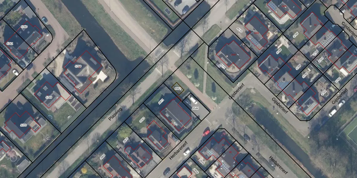Het perceel waarop het adres ligt is WDV01-C-6952. De afkorting 'WDV01' staat voor kadastrale gemeente Waddinxveen. De gemiddelde perceelgrootte in Waddinxveen is 2161,35 m². Dit perceel is kleiner: de perceeloppervlakte bedraagt 24 m². Het kleinste perceel in de kadastrale gemeente is 0 m² groot. De grootste perceeloppervlakte is 49,8 ha. Op het perceel bevinden zich geen andere adressen. De huidige grenzen van het perceel zijn digitaal in de Basisregistratie Kadaster (BRK) geregistreerd op 27-05-2025.
