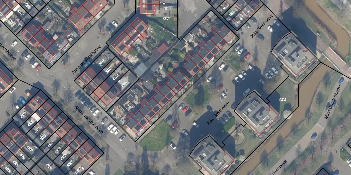 Joke Smithoeve 14 is gelegen op kadastraal perceel WDV01C3095. Deze kadastrale aanduiding is uniek en wordt gebruikt door het Kadaster om eigendomsrechten en andere zakelijke rechten vast te leggen. Het perceel maakt onderdeel uit van de kadastrale gemeente Waddinxveen.