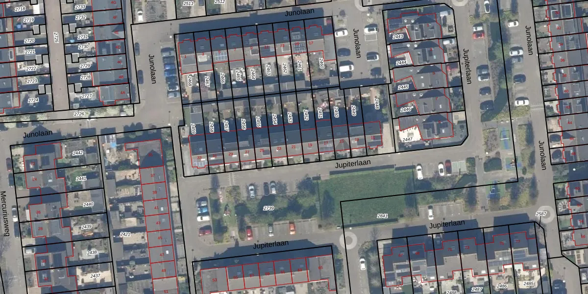 Jupiterlaan 21 is gelegen op kadastraal perceel WDV01F2453. Deze kadastrale aanduiding is uniek en wordt gebruikt door het Kadaster om eigendomsrechten en andere zakelijke rechten vast te leggen. Het perceel maakt onderdeel uit van de kadastrale gemeente Waddinxveen.