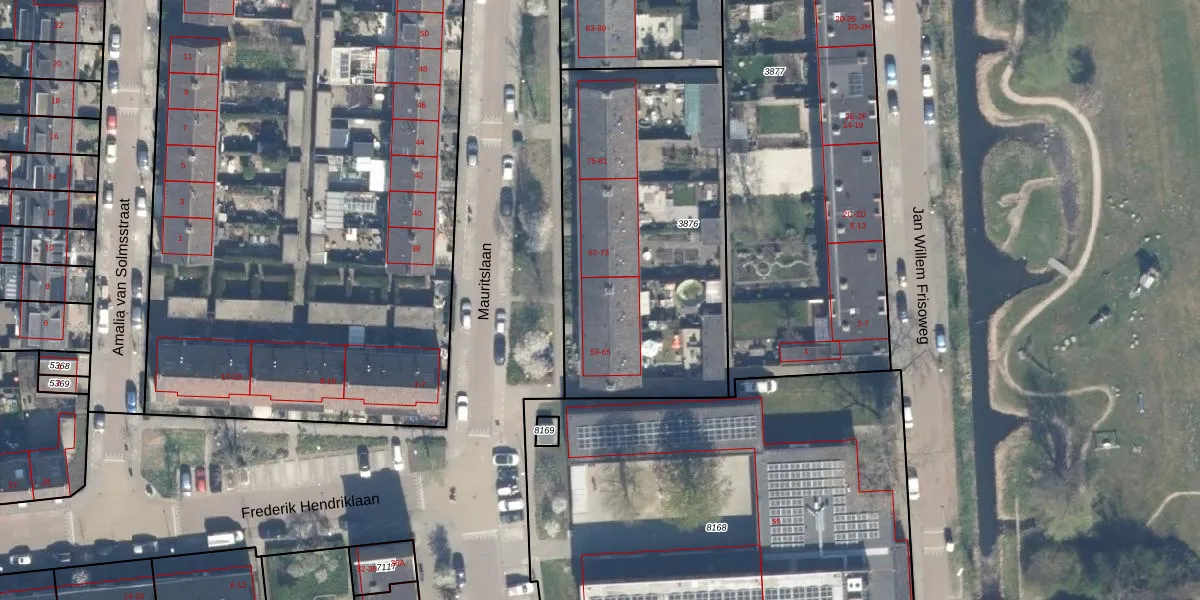 Mauritslaan 65 is gelegen op kadastraal perceel WDV01B3876. Deze kadastrale aanduiding is uniek en wordt gebruikt door het Kadaster om eigendomsrechten en andere zakelijke rechten vast te leggen. Het perceel maakt onderdeel uit van de kadastrale gemeente Waddinxveen.