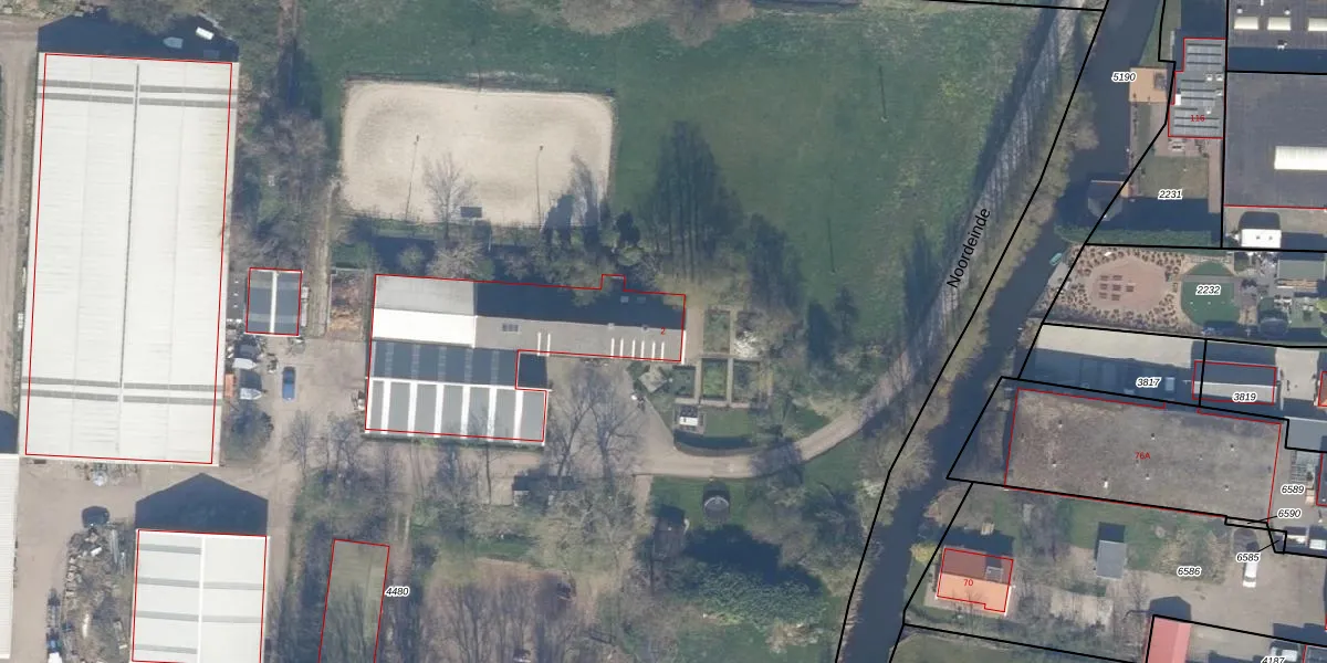 Het perceel waarop Noordeinde 2 staat heeft een oppervlakte van 2,0 ha. Dit is een zeer groot perceel. De perceeloppervlakte wordt geregistreerd door het Kadaster. Gedetailleerde informatie over de maten van dit perceel kunt u vinden in het rapport Kadastrale kaart met maatvoering van Noordeinde 2.