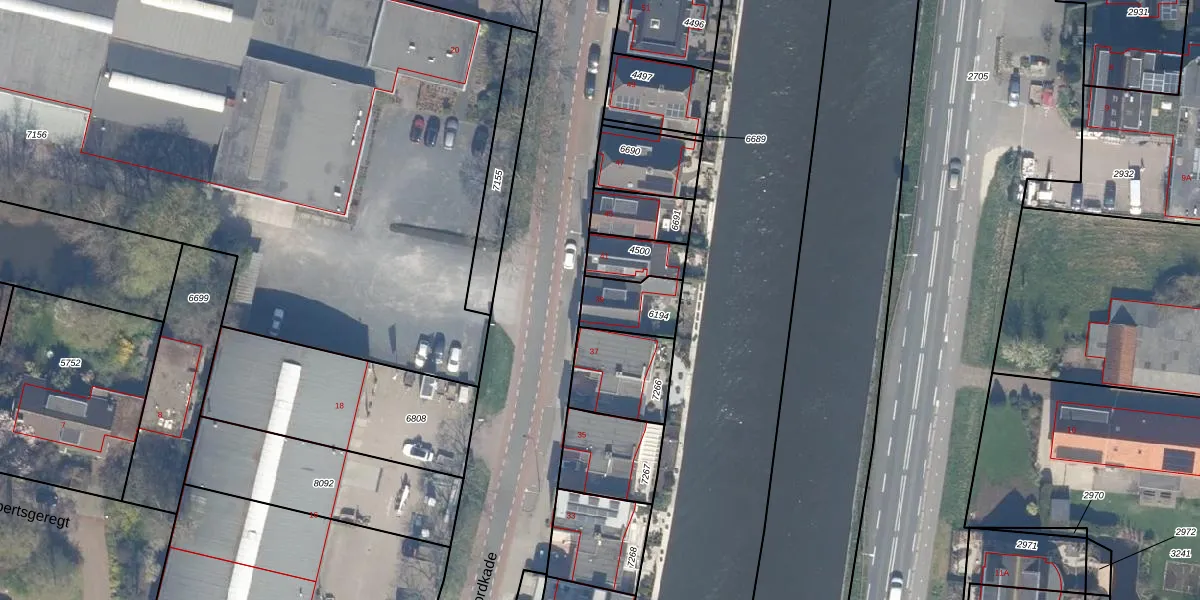 Het perceel waarop Noordkade 39 staat heeft een oppervlakte van 156 m². Dit is een middelgroot perceel. De perceeloppervlakte wordt geregistreerd door het Kadaster. Gedetailleerde informatie over de maten van dit perceel kunt u vinden in het rapport Kadastrale kaart met maatvoering van Noordkade 39.