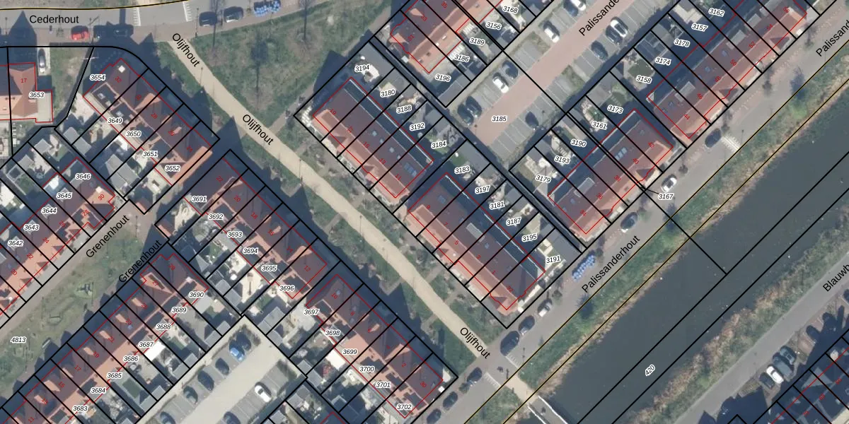 Het perceel waarop Olijfhout 9 staat heeft een oppervlakte van 196 m². Dit is een middelgroot perceel. De perceeloppervlakte wordt geregistreerd door het Kadaster. Gedetailleerde informatie over de maten van dit perceel kunt u vinden in het rapport Kadastrale kaart met maatvoering van Olijfhout 9.
