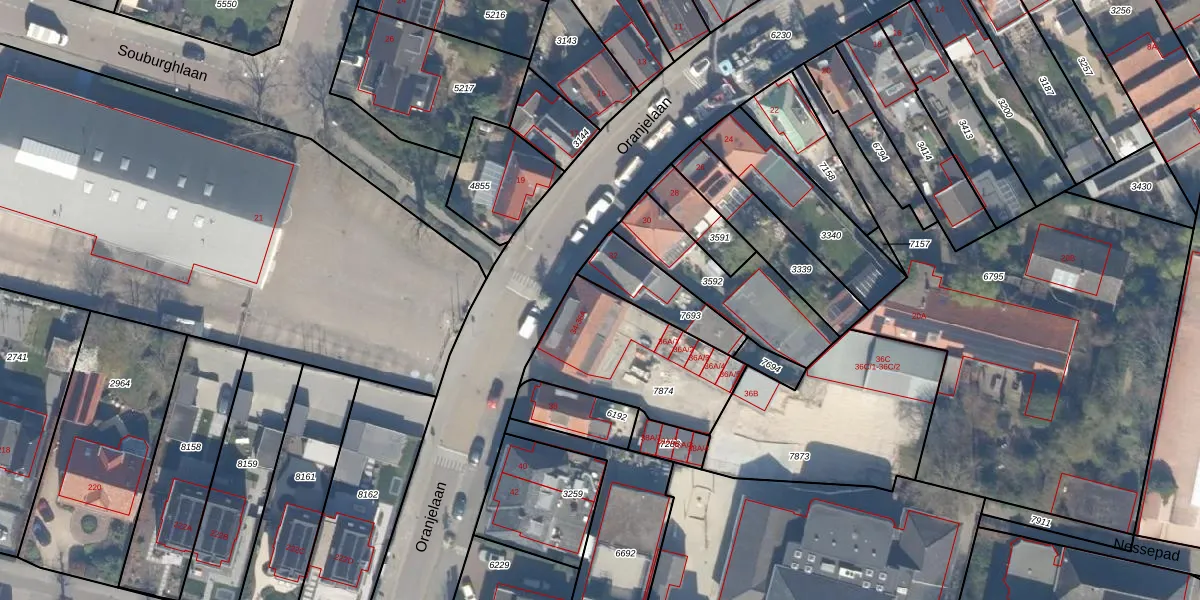Oranjelaan 34-A is gelegen op kadastraal perceel WDV01B7874. Deze kadastrale aanduiding is uniek en wordt gebruikt door het Kadaster om eigendomsrechten en andere zakelijke rechten vast te leggen. Het perceel maakt onderdeel uit van de kadastrale gemeente Waddinxveen.