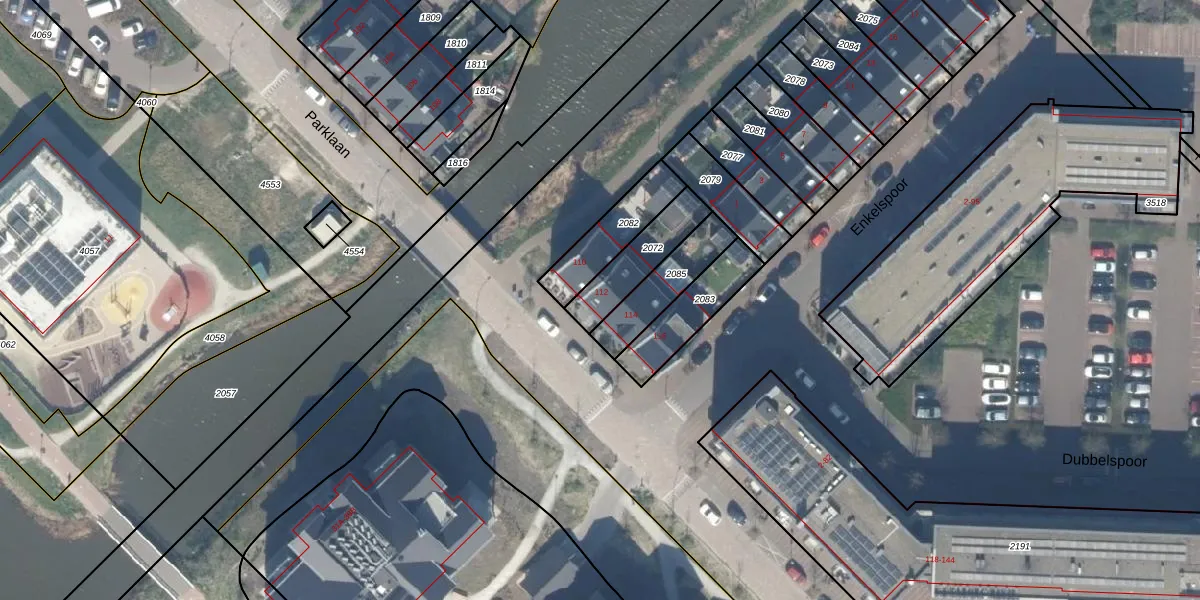 Parklaan 112 is gelegen op kadastraal perceel WDV01E2072. Deze kadastrale aanduiding is uniek en wordt gebruikt door het Kadaster om eigendomsrechten en andere zakelijke rechten vast te leggen. Het perceel maakt onderdeel uit van de kadastrale gemeente Waddinxveen.