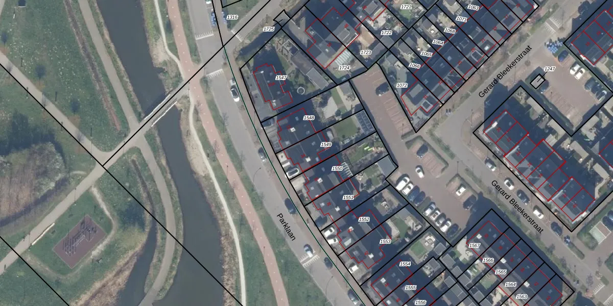 Parklaan 34 is gelegen op kadastraal perceel WDV01E1549. Deze kadastrale aanduiding is uniek en wordt gebruikt door het Kadaster om eigendomsrechten en andere zakelijke rechten vast te leggen. Het perceel maakt onderdeel uit van de kadastrale gemeente Waddinxveen.