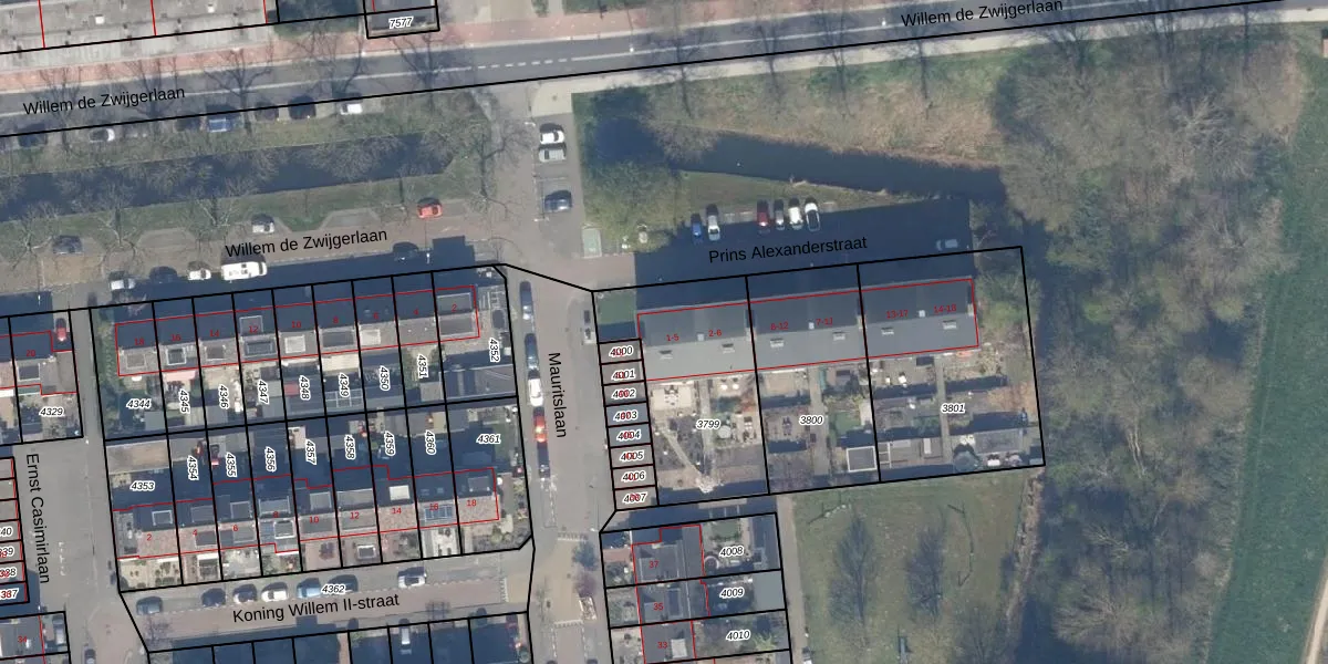 Het perceel waarop Prins Alexanderstraat 1 staat heeft een oppervlakte van 608 m². Dit is een groot perceel. De perceeloppervlakte wordt geregistreerd door het Kadaster. Gedetailleerde informatie over de maten van dit perceel kunt u vinden in het rapport Kadastrale kaart met maatvoering van Prins Alexanderstraat 1.