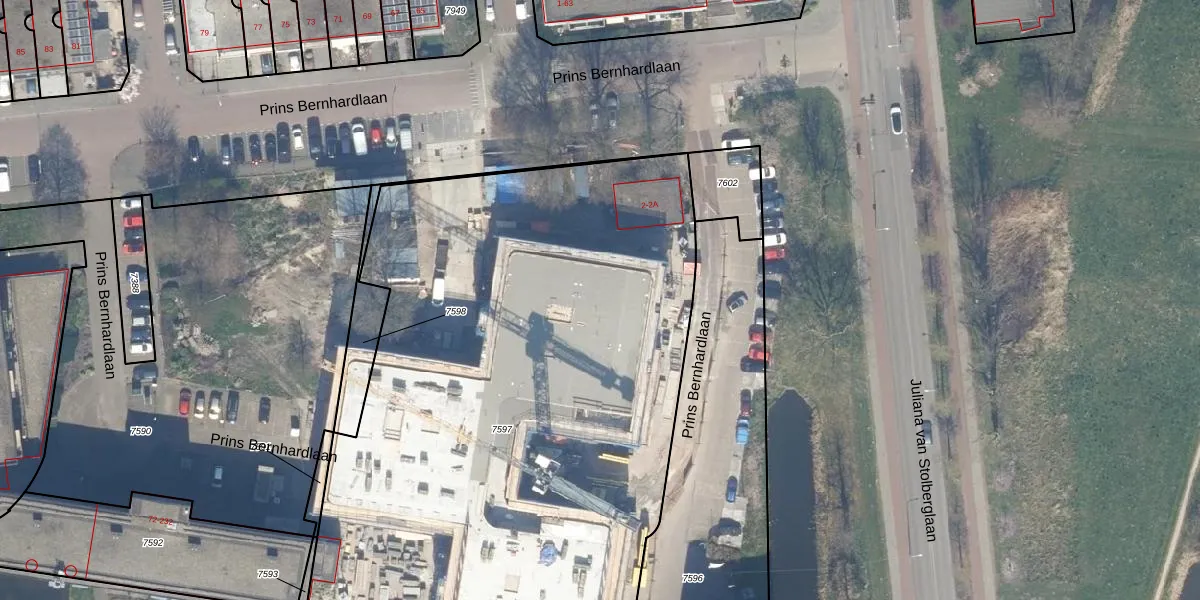 Prins Bernhardlaan 350 is gelegen op kadastraal perceel WDV01B7597. Deze kadastrale aanduiding is uniek en wordt gebruikt door het Kadaster om eigendomsrechten en andere zakelijke rechten vast te leggen. Het perceel maakt onderdeel uit van de kadastrale gemeente Waddinxveen.
