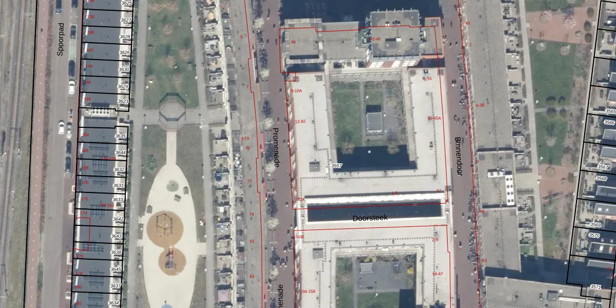 Het perceel waarop Promenade 66 staat heeft een oppervlakte van 3,1 ha. Dit is een zeer groot perceel. De perceeloppervlakte wordt geregistreerd door het Kadaster. Gedetailleerde informatie over de maten van dit perceel kunt u vinden in het rapport Kadastrale kaart met maatvoering van Promenade 66.