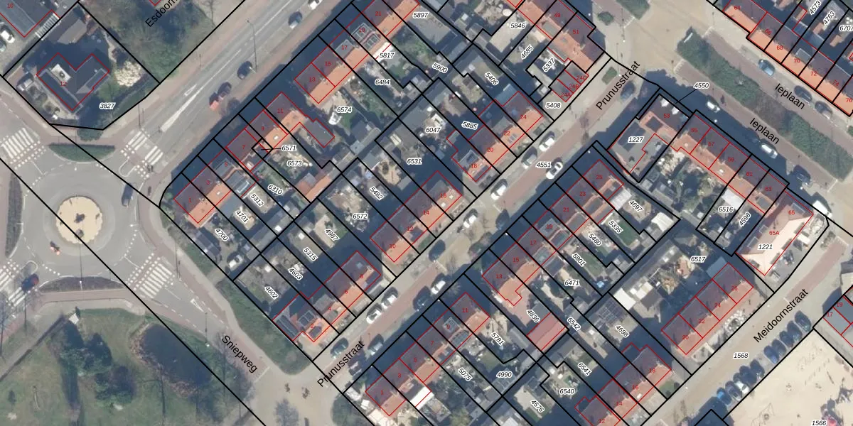 Het perceel waarop Prunusstraat 14 staat heeft een oppervlakte van 703 m². Dit is een groot perceel. De perceeloppervlakte wordt geregistreerd door het Kadaster. Gedetailleerde informatie over de maten van dit perceel kunt u vinden in het rapport Kadastrale kaart met maatvoering van Prunusstraat 14.