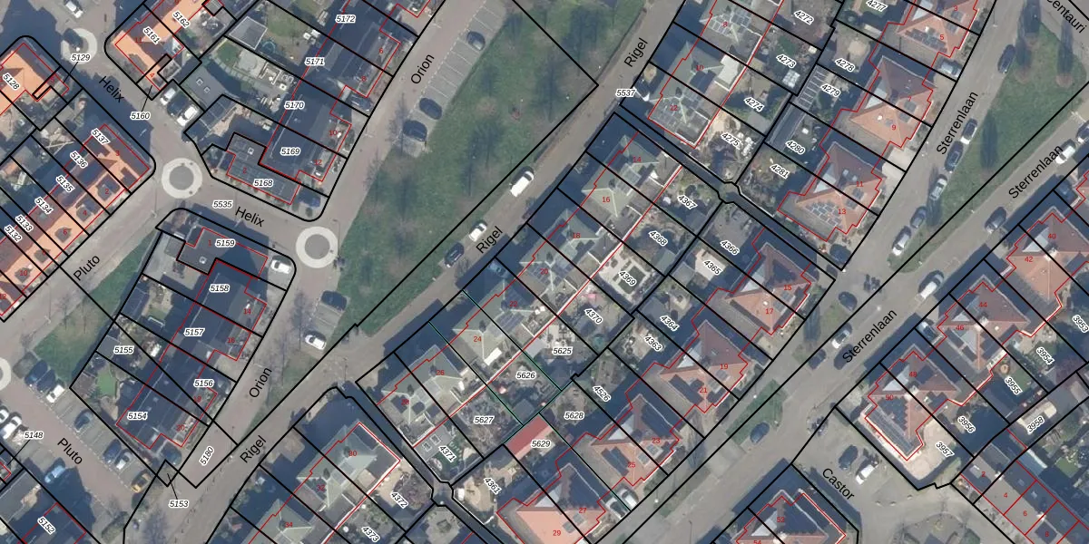 Het perceel waarop Rigel 20 staat heeft een oppervlakte van 238 m². Dit is een middelgroot perceel. De perceeloppervlakte wordt geregistreerd door het Kadaster. Gedetailleerde informatie over de maten van dit perceel kunt u vinden in het rapport Kadastrale kaart met maatvoering van Rigel 20.