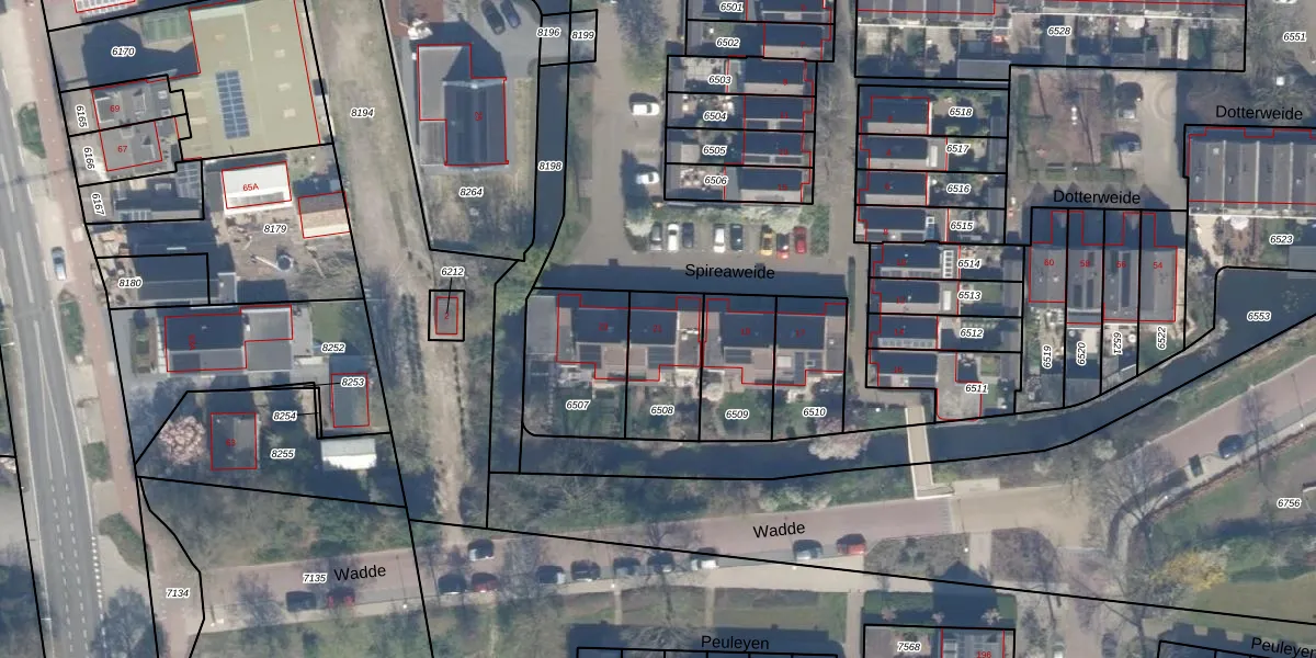 Spireaweide 21 is gelegen op kadastraal perceel WDV01B6508. Deze kadastrale aanduiding is uniek en wordt gebruikt door het Kadaster om eigendomsrechten en andere zakelijke rechten vast te leggen. Het perceel maakt onderdeel uit van de kadastrale gemeente Waddinxveen.