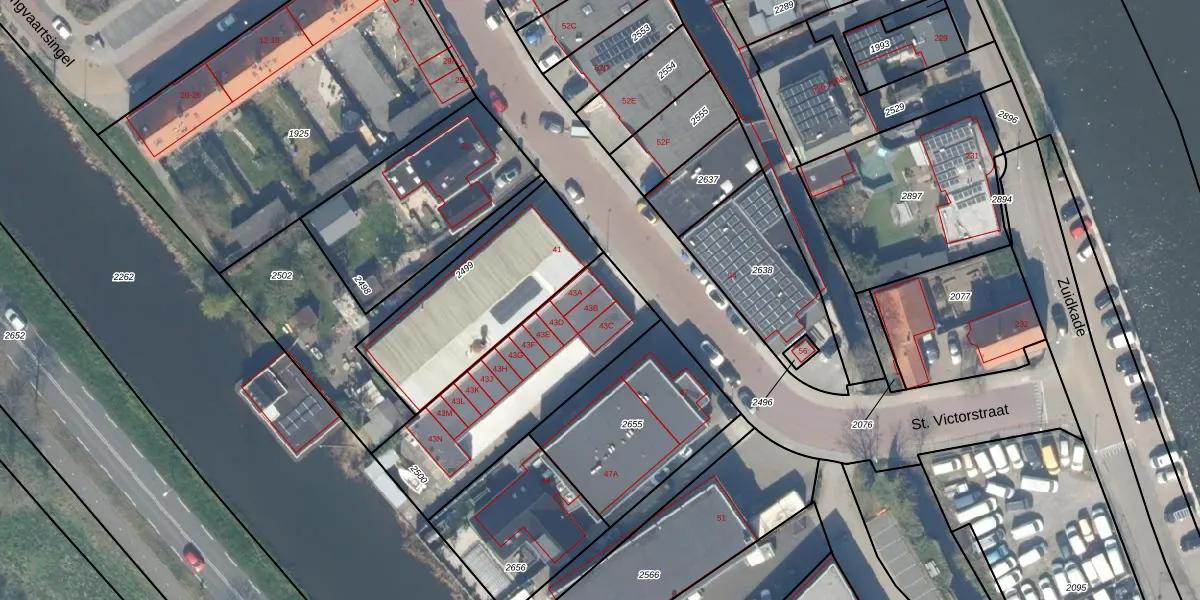 St. Victorstraat 43-B is gelegen op kadastraal perceel WDV01F2500. Deze kadastrale aanduiding is uniek en wordt gebruikt door het Kadaster om eigendomsrechten en andere zakelijke rechten vast te leggen. Het perceel maakt onderdeel uit van de kadastrale gemeente Waddinxveen.