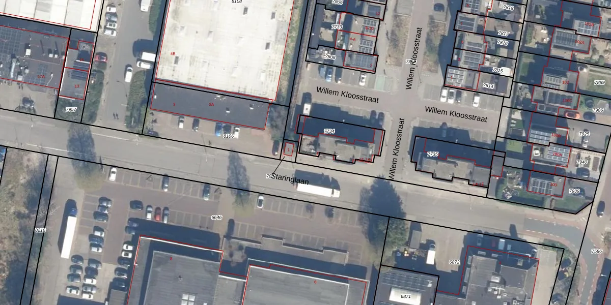 Staringlaan 1-K is gelegen op kadastraal perceel WDV01B7734. Deze kadastrale aanduiding is uniek en wordt gebruikt door het Kadaster om eigendomsrechten en andere zakelijke rechten vast te leggen. Het perceel maakt onderdeel uit van de kadastrale gemeente Waddinxveen.