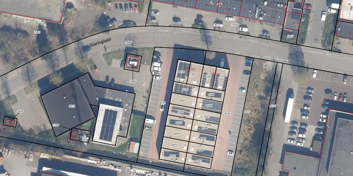 Het perceel waarop Staringlaan 16-C staat heeft een oppervlakte van 95 m². Dit is een klein perceel. De perceeloppervlakte wordt geregistreerd door het Kadaster. Gedetailleerde informatie over de maten van dit perceel kunt u vinden in het rapport Kadastrale kaart met maatvoering van Staringlaan 16-C.