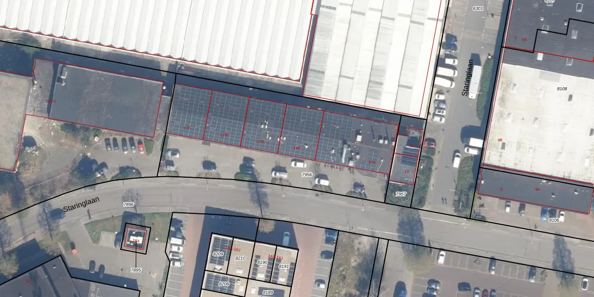 Staringlaan 17-C is gelegen op kadastraal perceel WDV01B7956. Deze kadastrale aanduiding is uniek en wordt gebruikt door het Kadaster om eigendomsrechten en andere zakelijke rechten vast te leggen. Het perceel maakt onderdeel uit van de kadastrale gemeente Waddinxveen.