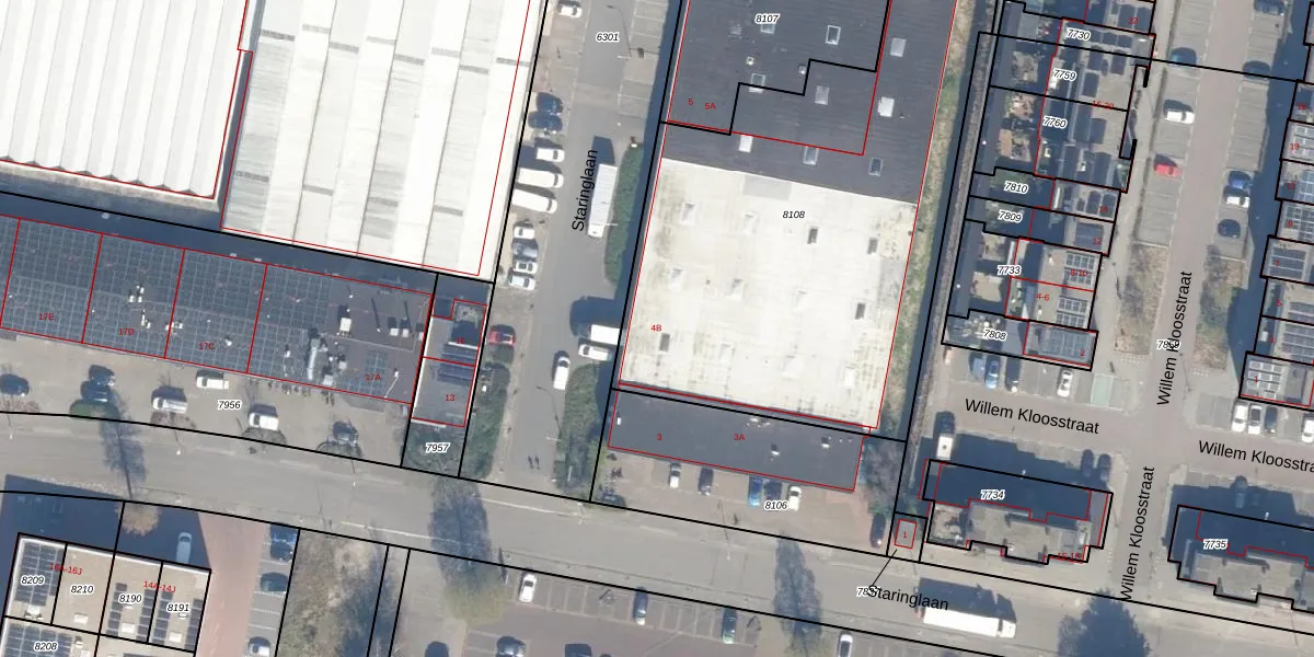 Staringlaan 3-B is gelegen op kadastraal perceel WDV01B8108. Deze kadastrale aanduiding is uniek en wordt gebruikt door het Kadaster om eigendomsrechten en andere zakelijke rechten vast te leggen. Het perceel maakt onderdeel uit van de kadastrale gemeente Waddinxveen.