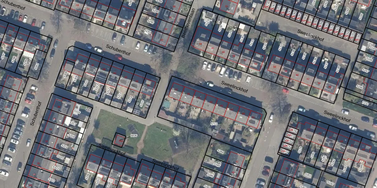 Het perceel waarop Sweelinckhof 39 staat heeft een oppervlakte van 1260 m². Dit is een zeer groot perceel. De perceeloppervlakte wordt geregistreerd door het Kadaster. Gedetailleerde informatie over de maten van dit perceel kunt u vinden in het rapport Kadastrale kaart met maatvoering van Sweelinckhof 39.