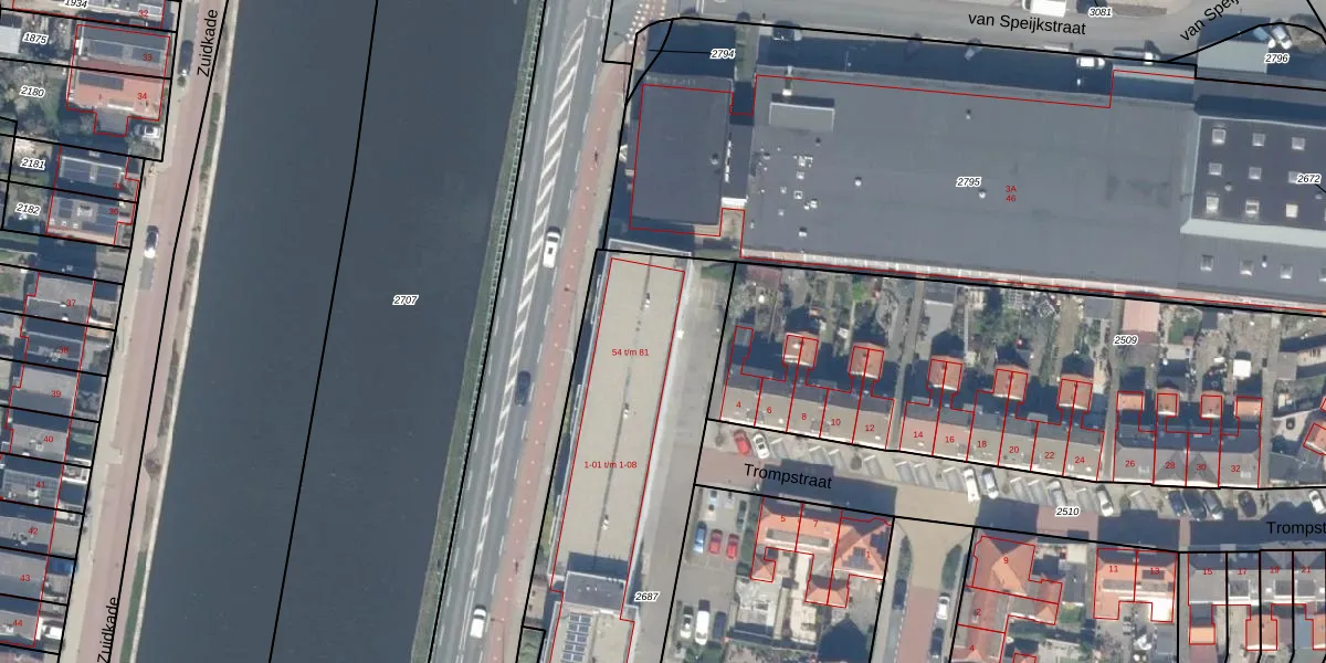 Trompstraat 1-02 is gelegen op kadastraal perceel WDV01G2687. Deze kadastrale aanduiding is uniek en wordt gebruikt door het Kadaster om eigendomsrechten en andere zakelijke rechten vast te leggen. Het perceel maakt onderdeel uit van de kadastrale gemeente Waddinxveen.