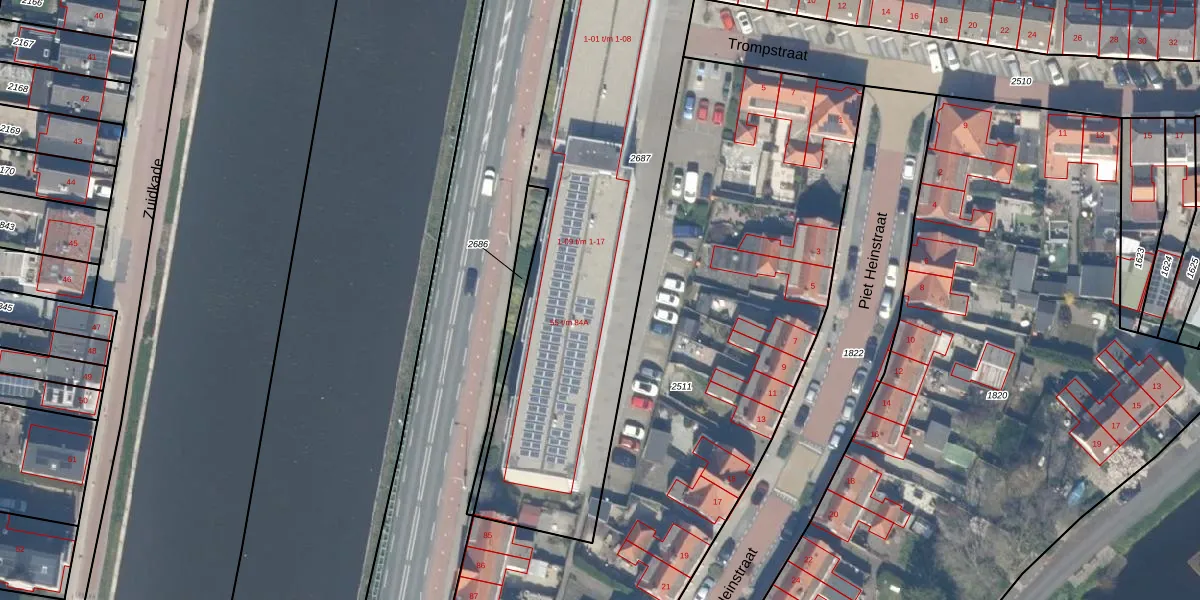 Trompstraat 1-12 is gelegen op kadastraal perceel WDV01G2687. Deze kadastrale aanduiding is uniek en wordt gebruikt door het Kadaster om eigendomsrechten en andere zakelijke rechten vast te leggen. Het perceel maakt onderdeel uit van de kadastrale gemeente Waddinxveen.