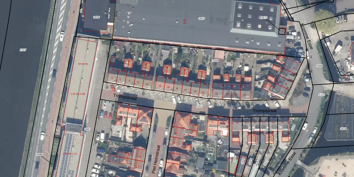 Trompstraat 18 is gelegen op kadastraal perceel WDV01G2509. Deze kadastrale aanduiding is uniek en wordt gebruikt door het Kadaster om eigendomsrechten en andere zakelijke rechten vast te leggen. Het perceel maakt onderdeel uit van de kadastrale gemeente Waddinxveen.