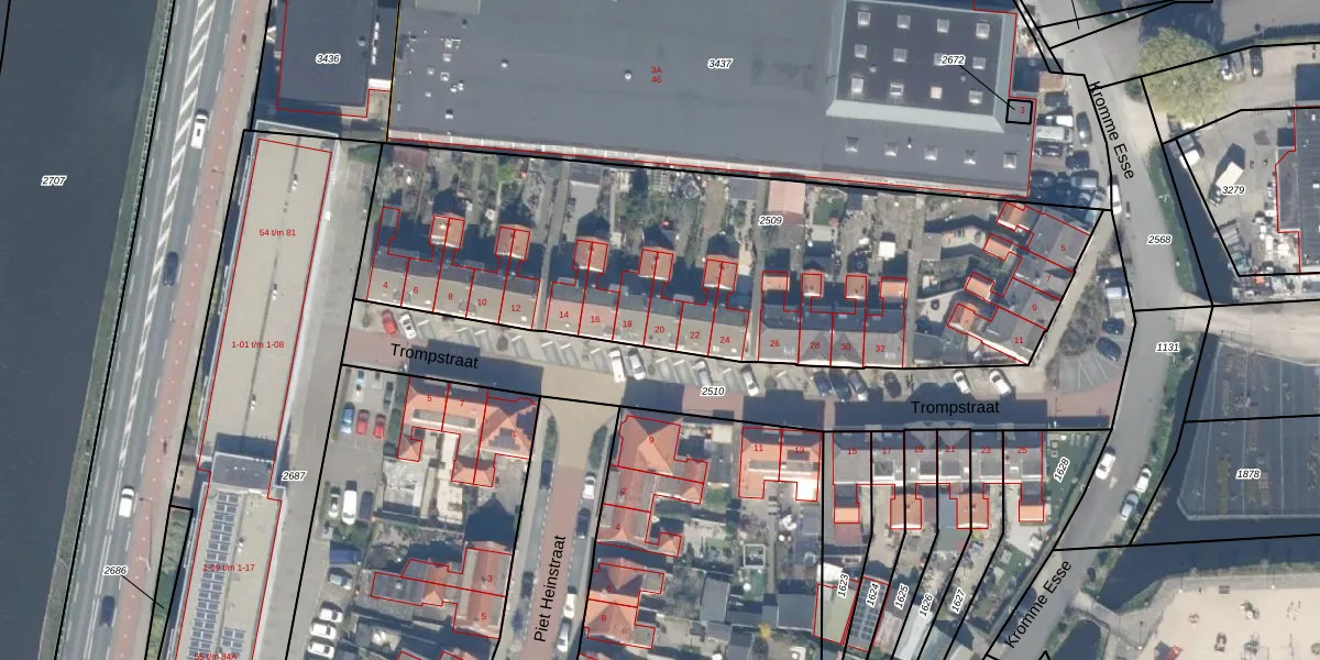 Trompstraat 20 is gelegen op kadastraal perceel WDV01G2509. Deze kadastrale aanduiding is uniek en wordt gebruikt door het Kadaster om eigendomsrechten en andere zakelijke rechten vast te leggen. Het perceel maakt onderdeel uit van de kadastrale gemeente Waddinxveen.
