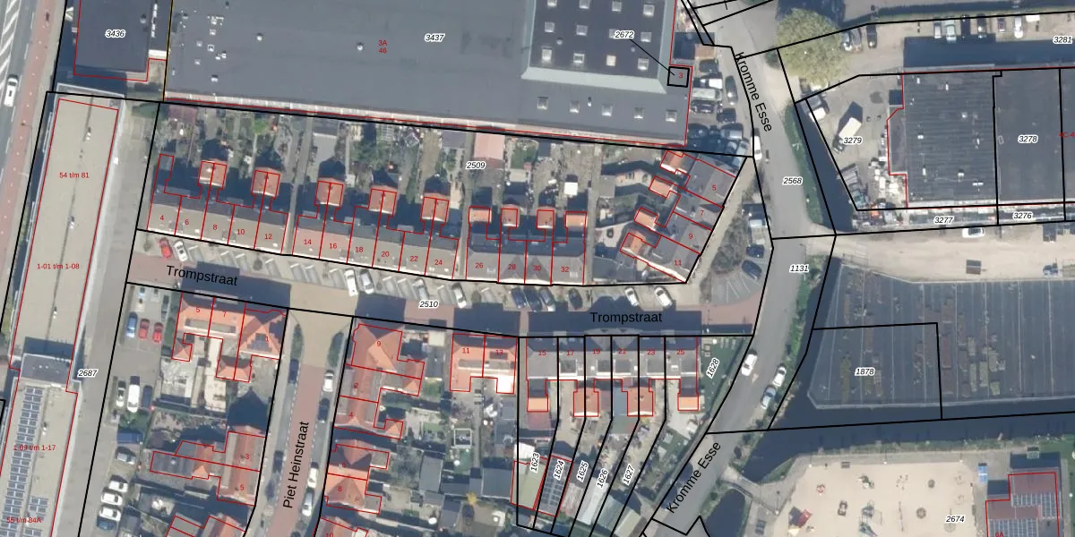 Trompstraat 30 is gelegen op kadastraal perceel WDV01G2509. Deze kadastrale aanduiding is uniek en wordt gebruikt door het Kadaster om eigendomsrechten en andere zakelijke rechten vast te leggen. Het perceel maakt onderdeel uit van de kadastrale gemeente Waddinxveen.
